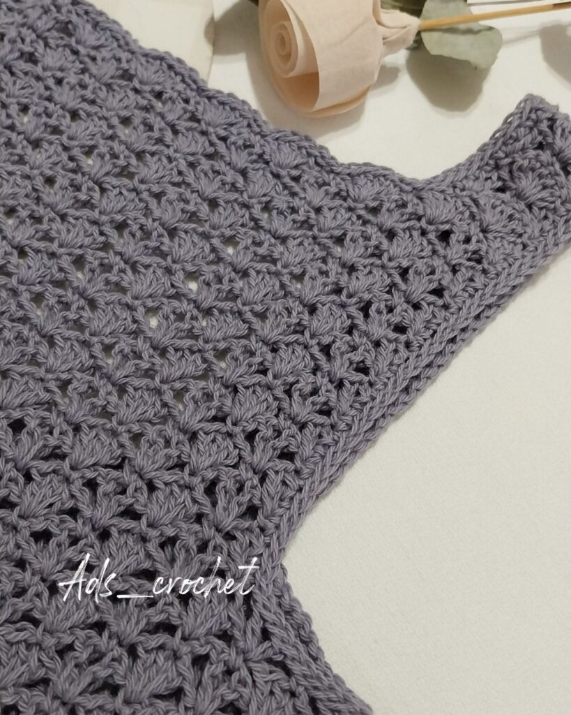 En mi caso tejí 2 opciones: una con hilo de bambú de grosor fingering (color lila) muy suave y liviano; y la otra con hilo de algodón de grosor fingering (gris medio) un poquito más armado que el anterior pero muy fresco para el verano
